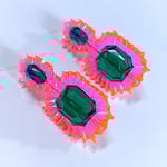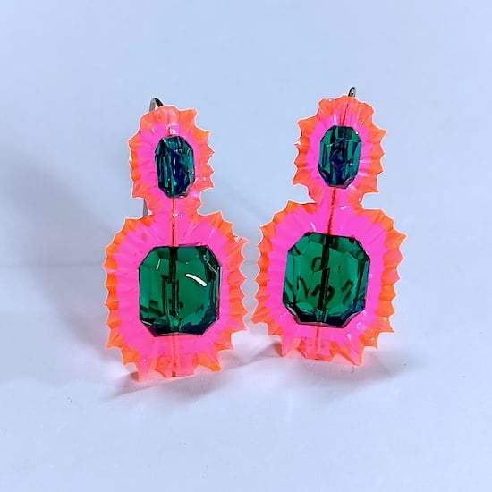 Hand coloured, cut, carved + heat fused layers of PVC with medical grade stainless steel wire hook.