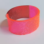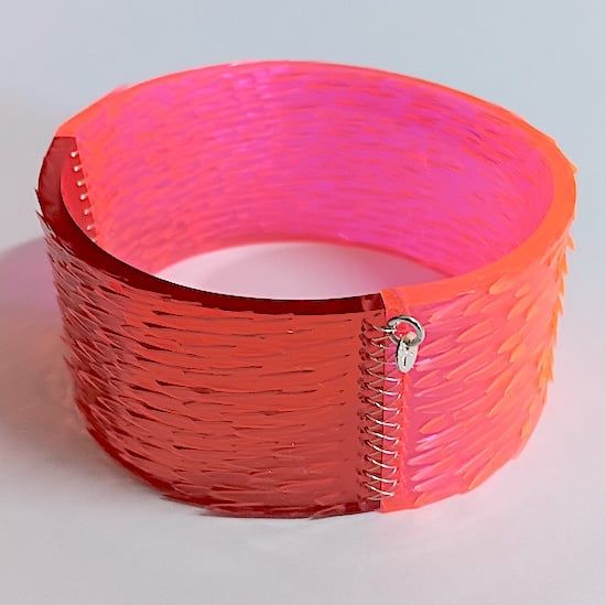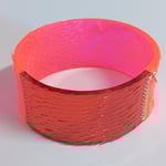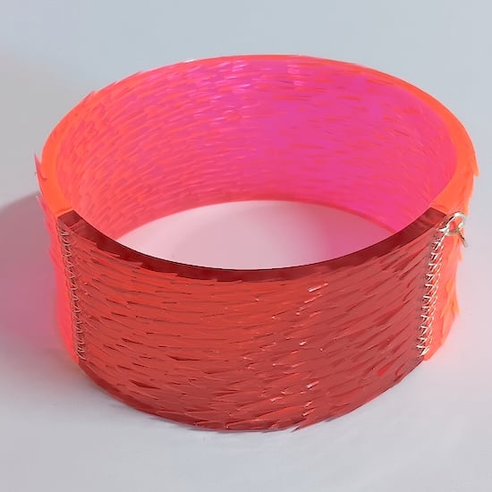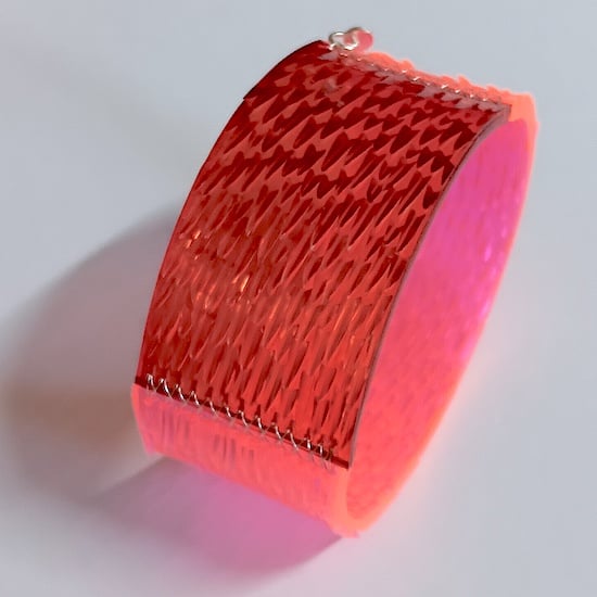 An intense vibrant pink that fluoresces orange on the cut edge paired with burgundy